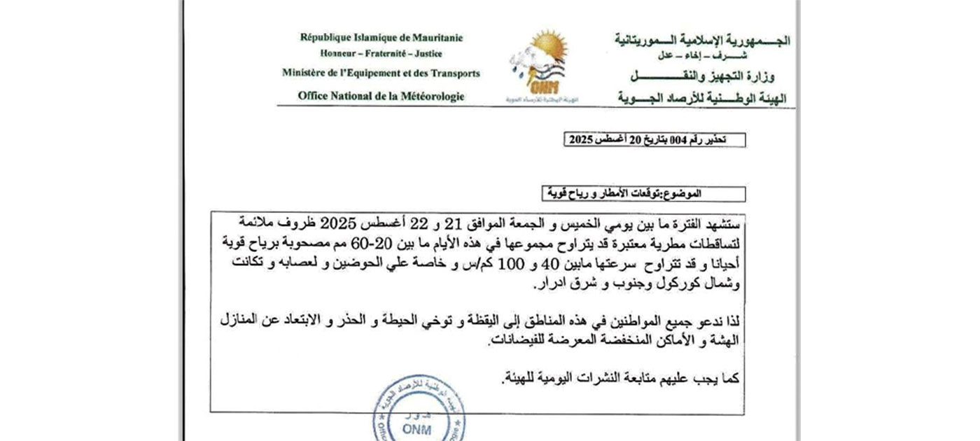 وقالت الهيئة، في بيان صادر أمس الأربعاء، إن هذه التوقعات تشمل ولايات الحوض الشرقي، الحوض الغربي، لعصابه، تكانت، شمال گورگول، إلى جانب جنوب وشرق آدرار.