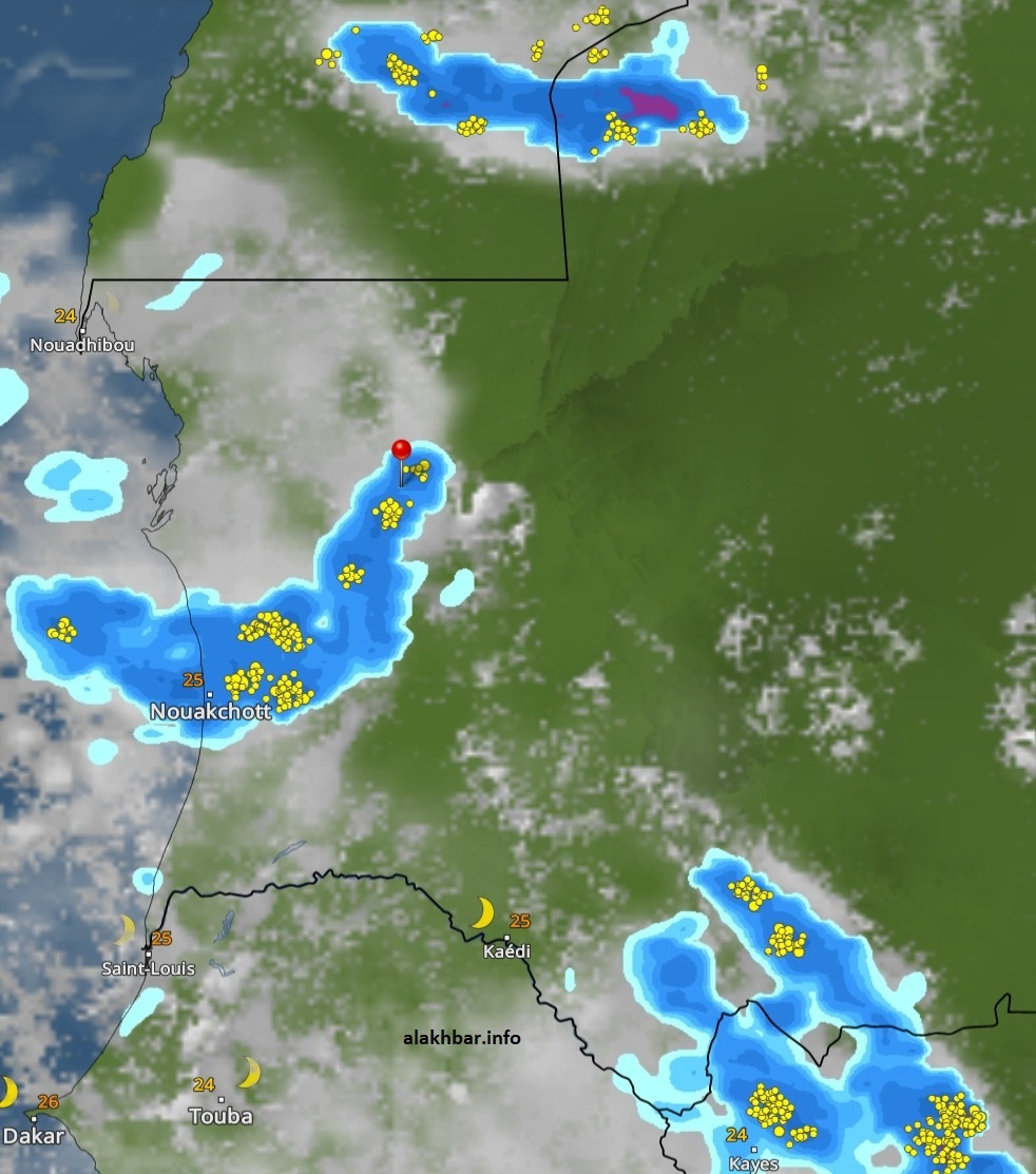 وأشارت الهيئة إلى وجود سحب ماطرة خفيفة حالياً على الحدود الجنوبية، وسحب خفيفة جداً في أجزاء من ولاية الترارزة، إضافة إلى سحب متفرقة محدودة الانتشار في أقصى شمال البلاد، في منطقة غير مأهولة.