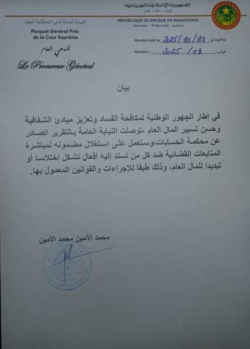 وأوضح بيان صادر أمس الأربعاء، وموقّع من طرف المدعي العام محمد الأمين محمد الأمين، أن هذه الخطوة تأتي في إطار الجهود الوطنية الرامية إلى مكافحة الفساد، وترسيخ مبادئ الشفافية، وتحسين آليات تسيير المال العام.