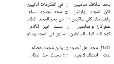 يحد أسلافك ساميين ::: في المكرمات أُبانيين كان لمجاد أُوارثين ::: مجد الجدود السام واشياخك كان ساكيين ::: من بحر…